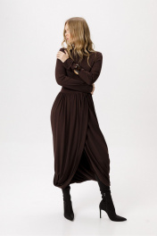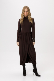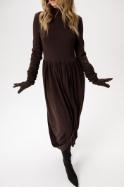 Трикотажное платье длины миди с асимметричной юбкой. Детали: прилегающий силуэт, нагрудные вытачки, платье отрезное по талии, юбка со сборками на запах, втачной одношовный рукав, воротник-стойка. Длина изделия по спинке в размерах около 134 см, длина рукава около 61 см