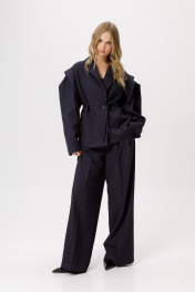 Оверсайз жакет со съёмным поясом. Детали: прямой силуэт, удлинённая линия плеча, втачной одношовный рукав с ассиметричными складками, функциональные карманы, центральная застёжка на 1 пуговицу, жакет на подкладке. Длина по спинке в размерах 40-46 около 67 см, в размерах 48-52 около 70 см, длина рукава около 61 см