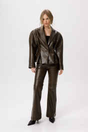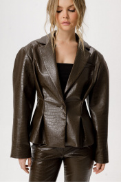 Приталенный жакет о-образного силуэта из экокожи с тиснением. Детали: полуприлегающий силуэт, пиджачный воротник, застежка на петлю и обтяжную пуговицу, жакет на подкладке Длина по спинке около 56,5 см в размерах 40-46 и около 59 см в размерах 48-52, длина рукава около 61 см