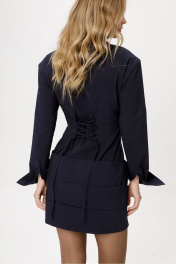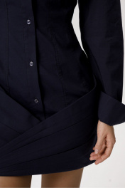 Хлопковое платье-рубашка длины мини со шнуровкой. Детали: прилегающий силуэт, удлинённая линия плеча, рельефные швы переда и спинки, ассиметричные складки на юбке по переду и спинке, юбка платья на подкладке, рубашечные рукава с притачными манжетами, рубашечный воротник с отрезной стойкой, застёжка на петли и пуговицы, шнуровка по спинке. Длина изделия по спинке в размерах 40-46 около 83 см, в размерах 48-52 около 86 см, длина рукава около 53 см