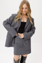 Мини-юбка из текстильной ткани в тонкую полоску со стразами. Детали: юбка с высокой посадкой, талиевые вытачки, застежка сзади на потайную молнию, на подкладке. Длина по боковому шву около 43 см в размерах 40-46 и около 46 см в размерах 48-52