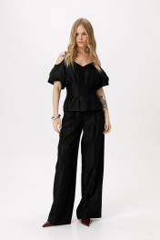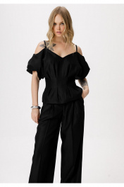 Приталенная блуза со складками. Детали: приталенный силуэт, застроченные складки по линии талии, V-образный вырез переда и спинки, рукава короткие цельнокроеные с вырезом по плечу, застежка на потайную молнию по спинке, на подкладке. Длина от бретели до низа по переду около 56 см в размерах 40-46 и около 58,5 см в размерах 48-52