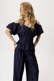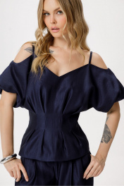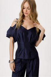 Приталенная блуза со складками. Детали: приталенный силуэт, застроченные складки по линии талии, V-образный вырез переда и спинки, рукава короткие цельнокроеные с вырезом по плечу, застежка на потайную молнию по спинке, на подкладке. Длина от бретели до низа по переду около 56 см в размерах 40-46 и около 58,5 см в размерах 48-52