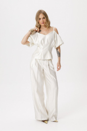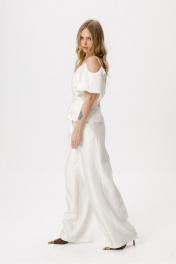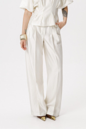 Широкие брюки-палаццо со стрелками. Детали: брюки с притачным поясом со шлевками, складки у пояса, застежка на молнию и пуговицу, боковые карманы, заутюженные стрелки. Задние части брюк с вытачками и имитацией карманов. Длина по боковому шву с поясом около 109,5 см, длина по внутреннему шву около 83 см