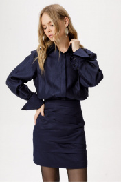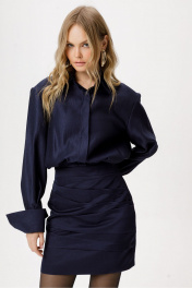 Платье-рубашка длины мини. Детали: платье полуприлегающего силуэта, отрезное по талии с напуском, нижняя часть переда с ассиметричными складками, нижняя часть спинки с талиевыми вытачками, верхняя часть платья со складками на талии, рубашечный воротник, застёжка на потайную планку с пуговицами, потайная молния в боковом шве, рубашечный покрой рукава с расширенным плечом, широкие манжеты. Юбка платья на подкладке. Длина изделия по спинке около 93 см в размерах 40-46 и около 76 см в размерах 48-52. Длина рукава с манжетой в подогнутом виде около 58 см