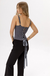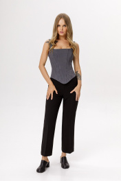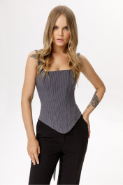 Корсет с глубоким квадратным вырезом из костюмной ткани в тонкую полоску со стразами. Детали: прилегающий силуэт, фигурный вырез переда и спинки, рельефные швы с регилиновыми вставками, фигурный низ, застежка-шнуровка по спинке, регулируемые бретели. Длина корсета по боковому шву около 30 см в размерах 40-46 и около 31 см в размерах 48-52.