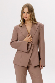 Приталенный жакет с разрезами по низу рукавов (приобрести брюки с фото можно по арт. 6341). Детали: полуприлегающий силуэт, втачной двухшовные рукава, смещённая застёжка на одну петлю и пуговицу. Длина по спинке около 65 см в размерах 40-46, около 68 см в размерах 48-52, длина рукава около 62 см.