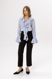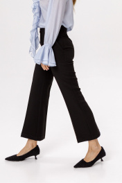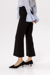 Укороченные брюки-клёш со стрелками (приобрести блузу с фото можно по арт. 6561). Детали: брюки клёш с притачным поясом со шлёвками, наклонные карманы в боковых швах, застёжка на молнию и крючок, талиевые вытачки на передних и задних половинках брюк. Длина по боковому шву с поясом около 96 см в размерах 40-46 и около 98 см в размерах 48-52. Длина по внутреннему шву около 67 см