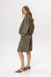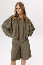 Шорты-бермуды из замши (приобрести бомбер с фото можно по арт. 6592). Детали: широкие бермуды, притачной пояс со шлёвками, застёжка на молнию и кнопку, перед с наклонными карманами, спинка с кокеткой и двумя накладными карманами. Длина по боковому шву с поясом около 60 см в размерах 40-52. Длина по внутреннему шву около 31 см в размерах 40-52.
