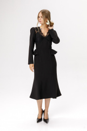 Приталенное платье с кружевным лифом и отлетными деталями по талии. Детали: прилегающий силуэт, фигурный лиф переда, отрезная линия талии, рельефные швы по юбке платья, потайная застежка по спинке, втачные длинные рукава со сборкой по окату, на подкладке. Длина по спинке около 111 см, длина рукава около 59 см