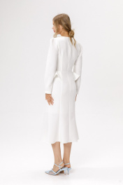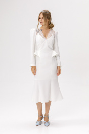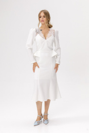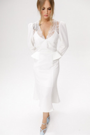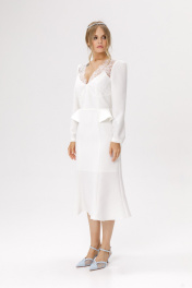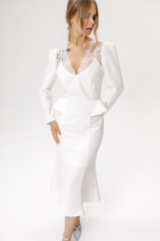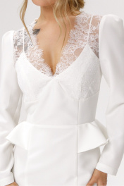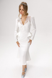 Приталенное платье с кружевным лифом и отлетными деталями по талии. Детали: прилегающий силуэт, фигурный лиф переда, отрезная линия талии, рельефные швы по юбке платья, потайная застежка по спинке, втачные длинные рукава со сборкой по окату, на подкладке. Длина по спинке около 111 см, длина рукава около 59 см