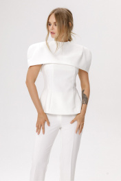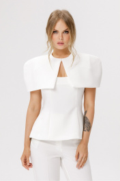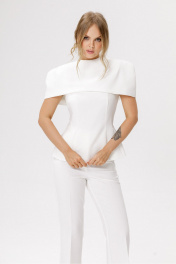 Приталенная блуза с укороченным кейпом. Детали: блуза прилегающего силуэта, кареобразный вырез горловины переда и спинки, рельефные швы, потайная застежка по спинке, на подкладке. Кейп с круглой горловиной и вытачками по плечам, плечевые накладки, застежка на навесную петлю и пуговицу, на подкладке. Кейп не имеет переда и спинки. Длина топа по боковому шву около 56 см в размерах 40-46, около 58,5 см в размерах 48-52. Длина кейпа около 21 см в 40 размере, около 22 см размерах 42-46 и около 23 см в размерах 48-52