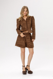 Мини-шорты из фактурной ткани (приобрести жакет с фото можно по арт. 6624). Детали: широкие расклешённые шорты, складки по передним половинкам, притачной пояс, застёжка на молнию и пуговицу, карманы в боковых швах. Длина по боковому шву с поясом около 43 см в размерах 40-46 и около 47 см в размерах 48-52 см. Длина по внутреннему шву около 12 см в размерах 40-46, около 15 см в размерах 48-53