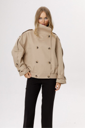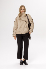 Укороченный оверсайз тренч с длинными патами (приобрести брюки с фото можно по арт. 6557). Детали: прямой силуэт, спинка с кокеткой и средним швом, высокий воротник-стойка, двубортная застёжка на петли и пуговицы, пояс переда и спинки на резинке, паты вдоль и по низу рукава, функциональные карманы по переду, тренч на подкладке. Длина по спинке без стойки около 60 см в размерах 40-46, около 64 см в размерах 48-52, длина рукава + плечо около 48+23 см