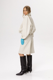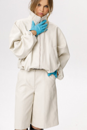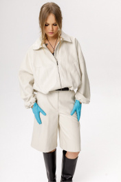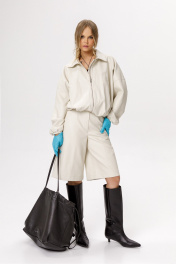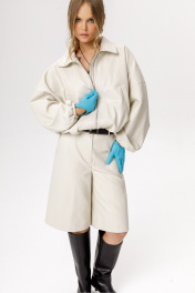 Шорты-бермуды до колена из экокожи (приобрести бомбер с фото можно по арт. 6633). Детали: широкие бермуды, притачной пояс со шлёвками, застёжка на молнию и кнопку, перед с наклонными карманы, спинка с кокеткой и двумя накладными карманами. Длина по боковому шву с поясом около 60 см в размерах 40-52. Длина по внутреннему шву около 31 см в размерах 40-52.