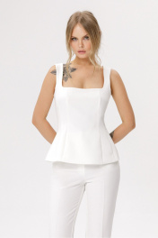 Костюм-двойка из приталенной блузы и брюк-клеш со стрелками. Детали: блуза прилегающего силуэта, кареобразный вырез горловины переда и спинки, рельефные швы, потайная застежка по спинке, на подкладке. Брюки с притачным поясом со шлевками, передние половины с заутюженными стрелками, застежка на молнию и потайные крючки, боковые карманы. Задние части брюк с вытачками и заутюженными стрелками. Пояс брюк без резинки. Длина топа по боковому шву около 56 см в размерах 40-46, около 58,5 см в размерах 48-52. Длина брюк по боковому шву с поясом около 112 см в размерах 40-46 и около 115,5 см в размерах 48-52. Длина по внутреннему шву около 82 см