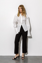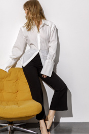 Комплект-двойка из рубашки со шнуровкой и укороченных брюк клёш со стрелками. Детали: рубашка приталенного силуэта, расширенная линия плеча, кокетка по переду и спинке, длинный рукав с широкой притачной манжетой, рубашечный воротник, центральная потайная застёжка на 7 пуговиц, петли в боковых швах. Брюки клёш с притачным поясом со шлёвками, передние половины с заутюженными стрелками, застёжка на молнию и потайной крючок, наклонные карманы в боковых швах, задние половины брюк с вытачками и заутюженными стрелками. Пояс брюк без резинки. Длина рубашки по спинке около 67 см в размерах 40-46 и около 70 см в размерах 48-52, длина рукава с манжетой около 64 см. Длина брюк по боковому шву с поясом около 96 см в размерах 40-46 и около 98 см в размерах 48-52. Длина по внутреннему шву около 67 см