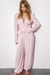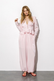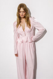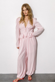Костюм-двойка из блузы с воланами и широких свободных брюк-алладинов. Детали: блуза приталенного силуэта, глубокий V-образный вырез переда с застежкой на навесные петли и пуговицы, пояс-кокетка с воланами, длинные рукава со сборкой по окату, фигурный низ, лиф на подкладке. Брюки с высокой посадкой на притачном эластичном поясе, без застежки, боковые карманы, низ брюк с эластичными манжетами, брюки на подкладке. Длина блузы по спинке около 50 см в размерах 40-46 и около 52,5 см в размерах 48-52, длина рукава около 63 см. Длина брюк по боковому шву с поясом около 108 см, длина по внутреннему шву около 75 см