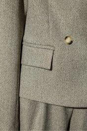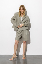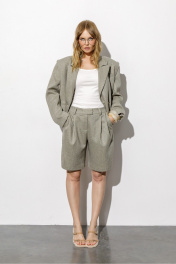 Костюм-двойка в «ёлочку» из укороченного оверсайз жакета с необработанными проймами и шорт-бермуд с широкими складками. Детали: жакет прямого силуэта, пиджачный воротник, двубортная застежка на две петли и пуговицы, функциональные карманы, спинка с фигурной кокеткой, рукава втачные, жакет на подкладке. Шорты с притачным поясом со шлевками, средняя посадка, застежка на молнию и брючный крючок, боковые карманы. Задние части шорт с вытачками и имитацией карманов. Длина жакета по спинке около 55 см в размерах 40-46 и около 56,5 см в размерах 48-52, длина рукавов около 61 см. Длина шорт по боковому шву с поясом около 51 см в размерах 40-46 и около 54 см в размерах 48-52. Длина шорт по внутреннему шву около 23 см в размерах 40-46 и около 25 см в размерах 48-52