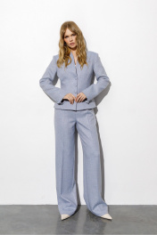 Костюм-двойка из приталенного жакета со съемным шарфиком и широких прямых брюк с рисунком «ёлочка». Детали: жакет полуприлегающего силуэта, цельнокроеный воротник-стойка, рельефные швы переда и спинки, функциональные карманы, застежка на петли и пуговицы, на подкладке. В комплекте съемный шарфик. Брюки с притачным поясом со шлевками, передние половины с небольшими застроченными мягкими складками и заутюженными стрелками, застежка на молнию и пуговицу, боковые карманы. Задние части брюк с вытачками и заутюженными стрелками. Пояс брюк прямой, без резинки. Длина жакета по спинке около 56 см в размерах 40-46 и около 58,5 см в размерах 48-52, длина рукава с оборкой около 62,5 см. Длина брюк по боковому шву с поясом около 114 см в размерах 40-46 и около 115,5 см в размерах 48-52. Длина по внутреннему шву около 83 см