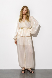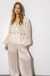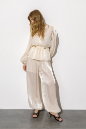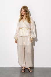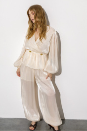 Костюм-двойка из блузы и широких свободных брюк-алладинов из фактурного шифона. Детали: блуза приталенного силуэта и свободного покроя, глубокий V-образный вырез переда на запах, имитация застежки с декоративными пуговицами, талия с резинкой, длинные рукава со сборкой по окату и притачными эластичными манжетами, блуза на хлопковой на подкладке. Брюки с высокой посадкой на притачном эластичном поясе, без застежки, боковые карманы, низ брюк с эластичными манжетами, брюки на хлопковой подкладке. Длина блузы по спинке около 59 см в размерах 40-46 и около 63 см в размерах 48-52, длина рукава около 63 см. Длина брюк по боковому шву с поясом около 108 см, длина по внутреннему шву около 75 см