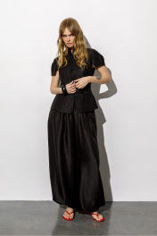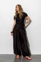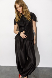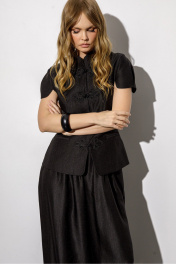 Комплект-двойка из приталенного жакета с коротким рукавом и широких брюк алладинов. Детали: жакет прилегающего силуэта, талиевые вытачки и рельефы по переду и спинке, спинка со средним швом, фигурный короткий рукав со складкой, воротник-стойка, функциональные карманы в рамку, центральная застёжка на 4 декоративные пуговицы с подзором, жакет на подкладке. Брюки О-силуэта, притачной пояс, пояс и манжеты по низу на резинке, карманы в боковых швах. Длина жакета по спинке около 59 см в размерах 40-46 и около 62 см в размерах 48-52, длина рукава около 16 см. Длина брюк по боковому шву с поясом около 110 см в размерах 40-52, длина по внутреннему шву около 75 см