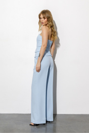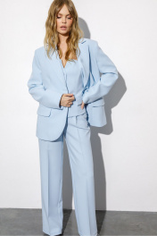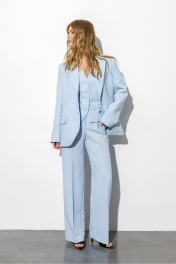 Костюм-тройка из оверсайз жакета, топа-корсета и прямых брюк-палаццо со стрелками. Детали: жакет прямого силуэта, расширенная линия плеч, пиджачный воротник, перед с прорезными функциональными карманами, однобортная застежка на петли и пуговицы, спинка со средним швом и шлицей, рукава втачные двухшовные, жакет на подкладке. Топ-корсет прилегающего силуэта, рельефные швы с регилином, функциональные карманы, застежка по переду на петли и пуговицы, спинка с эластичной вставкой, фигурный низ. Брюки с притачным поясом со шлевками, высокая посадка, передние половины с небольшими застроченными мягкими складками и заутюженными стрелками, застежка на молнию и пуговицу, боковые карманы. Задние части брюк с вытачками и заутюженными стрелками. Пояс прямой, без резинки. Длина жакета по спинке около 69 см в размерах 40-46 и около 72 см в размерах 48-52, длина рукавов около 62 см. Длина топа по спинке около 27,5 см в размерах 40-46 и около 29 см в размерах 48-52. Длина брюк по боковому шву с поясом около 113 см в размерах 40-46 и около 114,5 см в размерах 48-52, длина по внутреннему шву около 82 см