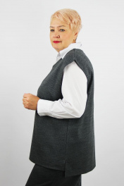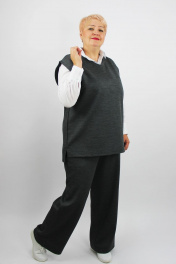 Комплект женский второго слоя одежды состоит из жилета и брюк. Жилет прямого силуэта, со спущенным плечевым поясом. Деталь переда короче детали спинки на 3 см. Вырез горловыны обработан обтачкой с прокладыванием отделочной строчки. Низ изделия подогнут. Срез проймы подогнут. Брюки прямого силуета. Верх брюк обработан притачным поясом. Передняя деталь пояса продублирована, в заднюю деталь пояса протянута эластичная тесьма шир. 4см. Низ брюк подогнут.