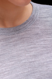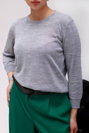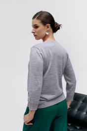Джемпер женский второго слоя одежды. С втачным рукавом длиной 3/4. Круглый вырез горловины обработан бейкой сдвоенная кулирная гладь высотой в готовом виде 1,8 ± 0,2 см.. Низ станов и рукавов заработан ластиком 1х1 высотой в готовом виде 5,5 ± 0,5 см. -стан; 6,0 ± 0,5 см -рукав. По краю бейки и низу рукава проложена высокорастяжимая полушерстяная пряжа "Новинка" 110 Текс.