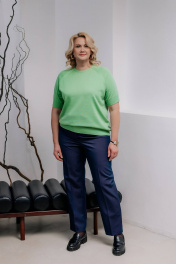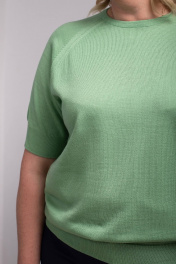Джемпер второго слоя одежды с коротким рукавом-реглан. Круглый вырез горловины закеттлёван бейкой-сдвоенная кулирная гладь высотой в готовом виде 1,5+0,2 см. По краю бейки проложена "Новинка" 110Текс. Низ изделия и рукавов заработан ластиком 1х1 высотой в гот. виде 5,5 ± 0,5см (станы), 6,0 ± 0,5см (рукава) По краю низа рукава проложена "Новинка" 110Текс