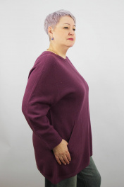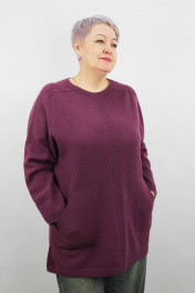 Джемпер цельновязаный, второго слоя, удлинненый, прямого силуэта, с длинным рукавом реглан-погон. На переде вывязаны карманы.
