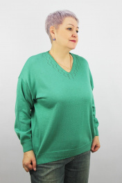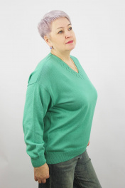 Джемпер женский второго слоя одежды, прямого силуэта, с длинным рубашечным рукавом. Низ изделия и рукавов заработан ластиком. V-образная горловина вывязана