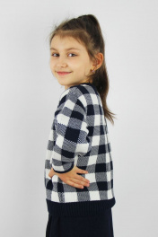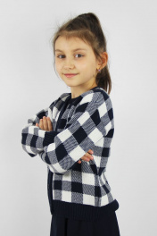 Жакет второго слоя одежды, прямого силуэта, с длинным рубашечным рукавом. Круглый вырез горловины обработан бейкой. Застежка на петли и пуговицы Ø15 мм. Количество пуговиц - 6+1 шт. на рост 122/128. Количество пуговиц 7+1 с роста 146.