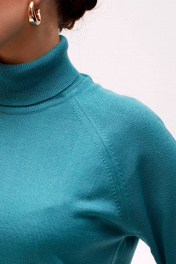 Свитер прямого силуэта, второго слоя одежды, с длиным рукавом реглан. Круглый вырез горловины обработан высоким ластичным воротником-ластик высотой в готовом виде 16см+-1,0см в том числе сдвоенная кулирная гладь 1,0см+-0,2см.