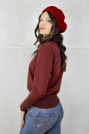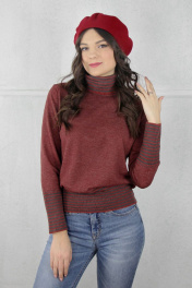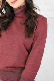 Свитер женский,второго слоя одежды,регулярный,полуприлегающего силуэта с длинным втачным рукавом. Круглый вырез горловины обработан высоким ластичным воротником-ластик1х1 высотой в готовом виде 16см+-1,0см в том числе сдвоенная кулирная гладь 1,0 см+-0,2см. Низ стана и рукавов заработан ластиком 1х1