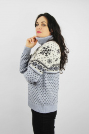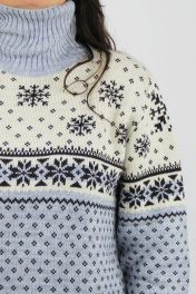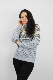 Свитер женский второго слоя одежды, регулярный, прямого силуэта. Рукав втачной длинный. Круглый вырез горловины обработан отложным воротником выс. в гот. виде 15,5+-0,8 см.