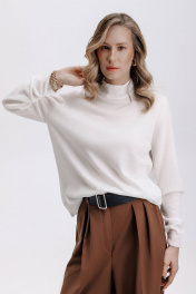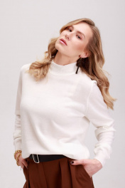 Свитер женский ,второго слоя одежды, с длинным втачным рукавом. Низ изделия и рукавов заработан ластиком 1х1, высотой в готовом виде 4,5см+-0,5см(станы),5,0+-0,5см (рукава). Воротник - двойная ластичная стойка 6,0см+-0,5см в готовом виде, полукеттлевка. По краю низа рукава проложена пряжа полушерстянная высокорастяжимая "Новинка" 110т