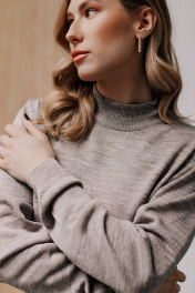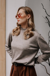 Свитер женский ,второго слоя одежды, с длинным втачным рукавом. Низ изделия и рукавов заработан ластиком 1х1, высотой в готовом виде 4,5см+-0,5см(станы),5,0+-0,5см (рукава). Воротник - двойная ластичная стойка 6,0см+-0,5см в готовом виде, полукеттлевка. По краю низа рукава проложена пряжа полушерстянная высокорастяжимая "Новинка" 110т