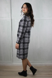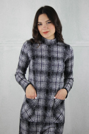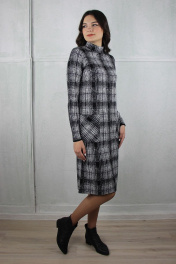 Платье второго слоя одежды, А-образного силуэта с длинным втачным рукавом, воротником -стойка, с застежкой молнией по спинке. На переде накладные карманы. Низ стана с подгибом.