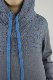 Джемпер второго слоя одежды, прямого силуэта, регулярный, с длинным втачным рукавом. Углубленный вырез горловины обработан притачным капюшоном с наложением срезов.