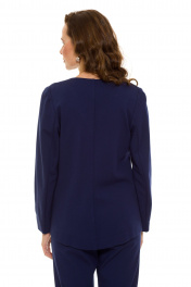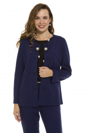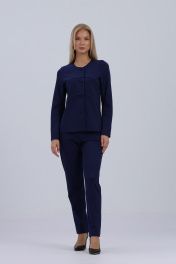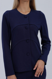 Жакет женский без подкладки,длиной до середины бедра.Силуэт прямой,слегка приталенный. Изделие без воротника. Застёжка на петли и пуговицы. Перед с фигурными поперечными швами.Вырез горловины округлый. Спинка со средним швом и округлой линей низа. Рукава втачные, двухшовные.