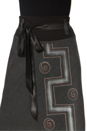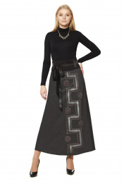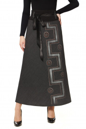 Юбка женская на подкладке длинная слегка расклешенная к низу. Пояс из трикотажного полотна, на поясе пять шлевок. Дополнительный пояс из аталасной ткани, вставляется в шлефки и завязывается. Спереди декоративный рисунок красками по ткани, закреплен, подлежит стирке в стиральной машине на декликатных режимах.