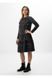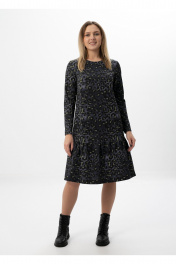 Платье длиной ниже колена, прямого силуэта. Перед с вытачками в области груди. В боковых швах карманы. Внизу пришит волан. Спинка со средним швом, застежка на петле и пуговице. Рукав втачной заужен к низу. Горловина полукруглой формы.