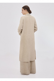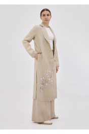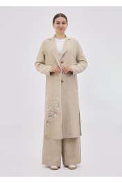 Кардиган пошит из натурального неокрашенного льна, умягченного по уникальной технологии, изделие мягкое и приятное на ощупь. Благотворное влияние энергетики натурального льна повышает стрессоустойчивость и дарит заряд положительных эмоций на весь день! Силуэт свободный, декорирован бахромой,ручной художественной росписью, центральная застежка, воротник пиджачного типа.Рукав втачной,двухшовный. Карманы расположены в боковых швах. Вид застёжки: пуговицы и петли. В боковых швах разрезы.