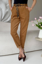 Брюки женские из текстильной ткани (вельвет-штрукс), слегка заужены к низу. В боковых швах расположены карманы. По низу передних половинок есть защип. Задняя половинка брюк с отрезной кокеткой и накладными карманами. Вверх брюк обработан поясом с резинкой (без молнии). ПОЯС ВХОДИТ В КОМПЛЕКТ. Промеры на примере 44 размера: ОТ 64 см (резинка в свободном состоянии), ОТ 84 (резинка в растянутом состоянии), ОБ 106 см. Ширина под ягодицей: 32 см. Ширина брючины по низу 16 см. Длина по боковому шву с учетом пояса 101 см.