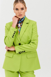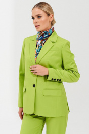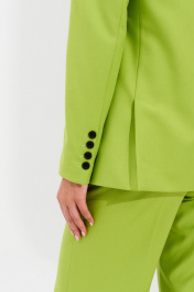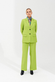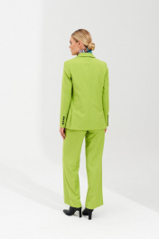 Костюм 2-предметный состоит из жакета и брюк. Жакет на подкладке. По переду воротник пиджачного типа, застёжка на петлю и пуговицу, по бокам прорезные карманы с клапаном. По спинке средний шов переходящий в шлицу. Брюки на притачном поясе, по спинке на резинке. По передним половинкам брюк функциональные карманы в боковых швах, застежка на молнию и крючки.