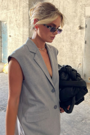 Однобортный жилет свободного силуэта. Воротник пиджачного типа. Спереди карманы с листочкой. Прямые брюки из костюмной ткани с вискозой. По бокам наклонные карманы. Застегиваются брюки на крючок и молнию, по спинке резинка.