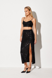 Фактура: пайетки. Силуэт: прямой. Длина: выше линии талии. Конструктивные элементы: на бретелях, вставка по спинке с настроченной эластичной нитью. Подкладка: есть.