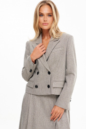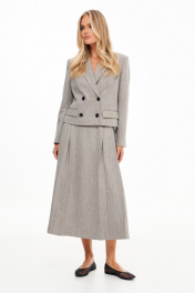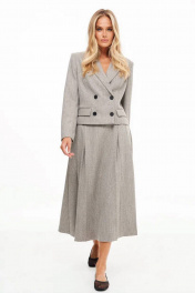Жакет: Фактура: шероховатая. Ткань: костюмная. Длина: чуть ниже линии талии. Силуэт: полуприлегающий. Рукава: длинные, втачные, двухшовные. Воротник: пиджачного типа. Карманы: по переду прорезные с клапанами и двумя обтачками. Застежка: двубортная на петли и пуговицы. Конструктивные элементы: рельефы по переду и спинке, локтевые швы заканчиваются закрытыми шлицами с 2мя декоративными пуговицами. Подкладка: есть. Юбка: Фактура: шероховатая. Ткань: костюмная. Длина: миди. Силуэт: А - силуэт. Карманы: в боковых швах. Застежка: сзади потайная "молния". Конструктивные элементы: односторонние складки от пояса. Тип посадки: средняя. Подкладка: есть.