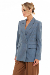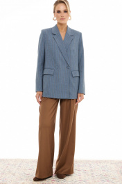 Жакет: Фактура: гладкая. Ткань: костюмная. Длина: ниже линии бедер. Силуэт: прямой. Рукава: втачные длинные. Воротник: пиджачный. Карманы: по переду прорезные с клапанами и двумя обтачками. Застежка: двубортная на петли и пуговицы. Конструктивные элементы: рельефы по переду и спинке, средний шов по спинке, локтевые срезы заканчиваются закрытыми шлицами с декоративными пуговицами. Подкладка: есть.